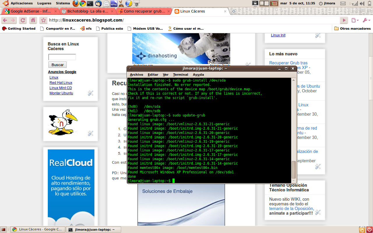 Con esto todo volvía a la normalidad, pero con windows XP añadido al Grub. Ahora sólo te falta reiniciar.