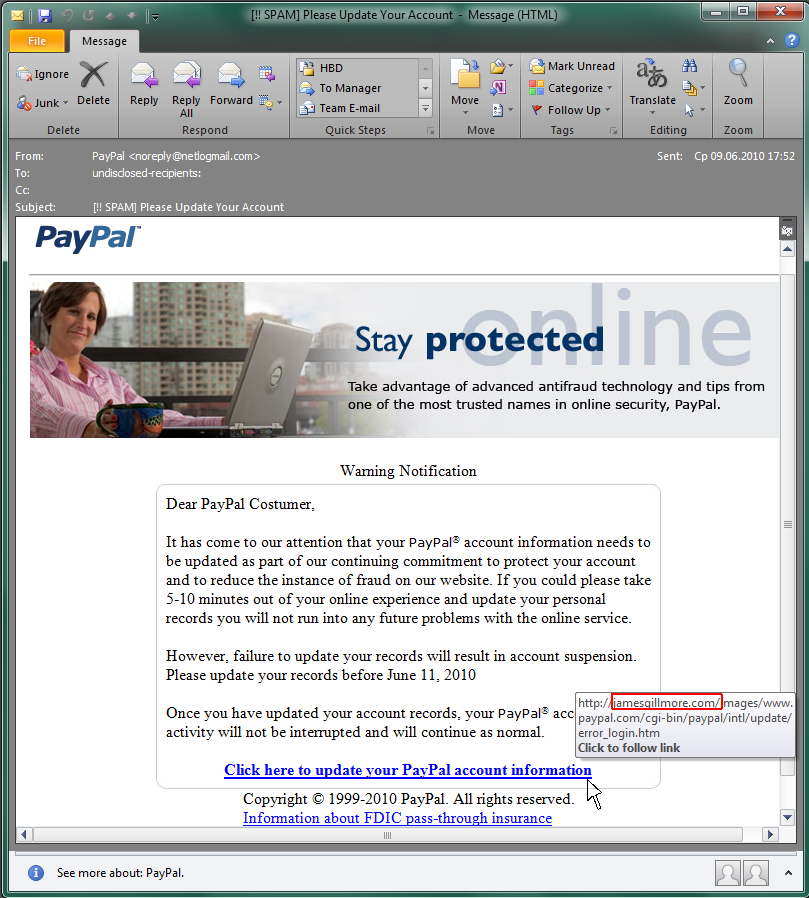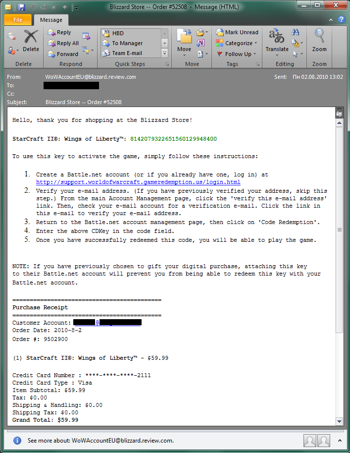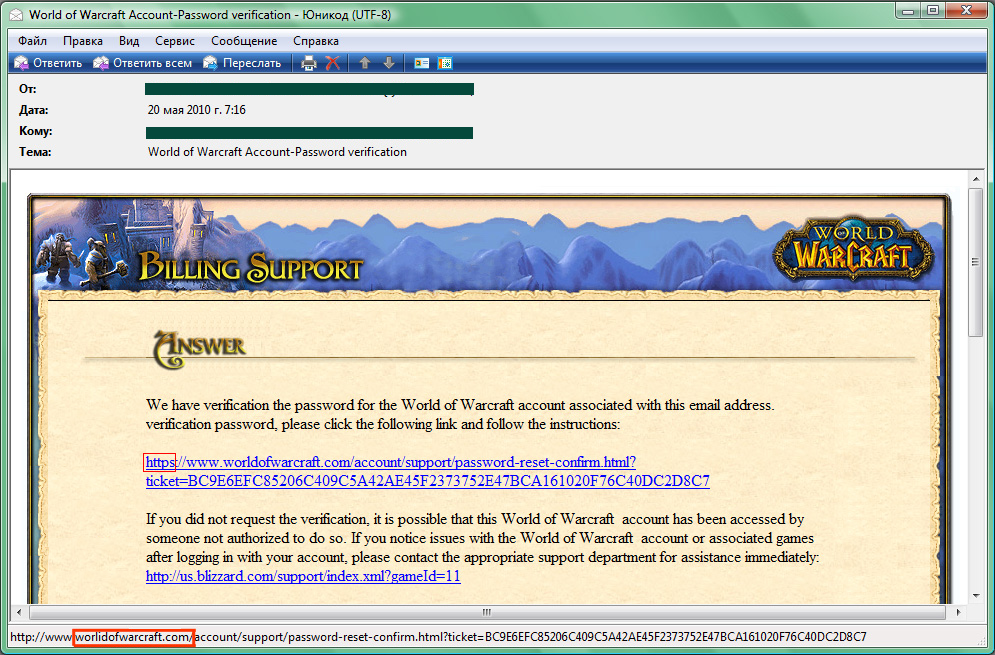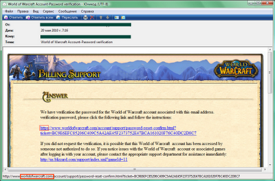 Sólo un usuario meticuloso podrá notar la letra « i » insertada en el nombre de dominio worlidofwarcraft.com, en el enlace URL provisto. Pero si uno está familiarizado con los métodos phishing, la trampa se detecta inmediatamente, pues un mensaje legítimo ¡nunca pedirá a sus usuarios que activen un enlace para identificarse!
