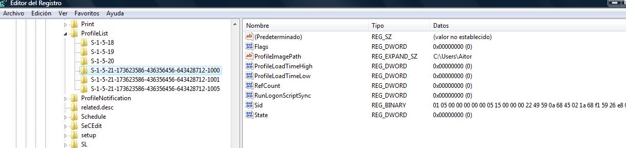 1.-Vamos a HKEY_LOCAL_MACHINE\SOFTWARE\Microsoft\Windows NT\CurrentVersion\ProfileList:
