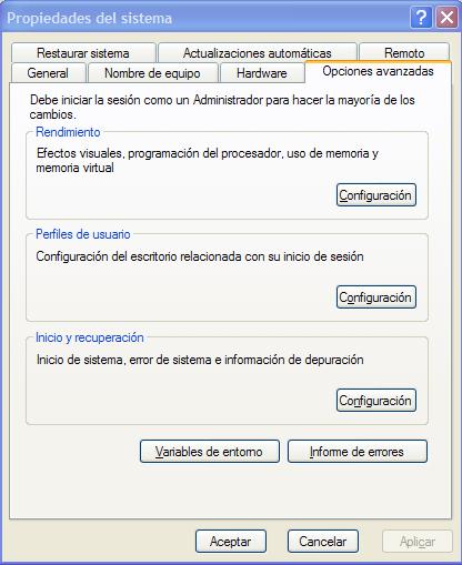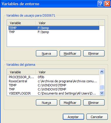 Para cambiar estas ubicaciones basta modificar las variables de entorno. Para ello botón derecho sobre «Mi PC» seleccionamos «Propiedades«, sobre la pestaña de «Opciones Avanzadas» seleccionamos «Variables de entorno» y modificamos las TEMP y TMP del usuario para los temporales de usuario y las TEMP y TMP de Sistema para los temporales del sistema.