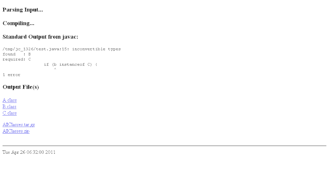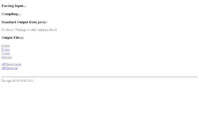 El mismo permite subir archivos fuente y librerías y compilar el código. Si hubo errores durante el proceso de compilación, el servicio devuelve la salida de javac. Lo más interesante que tiene, es que si estamos compilando un applet lo incluirá directamente en la página para probar su funcionamiento.