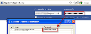 Todos los navegadores traen esta opción, que guarda el nombre de usuario y contraseña asociadas a la pagina para que no estos datos no tengan que ser digitados cada vez que ingresamos a ella. En Internet se pueden encontrar aplicaciones que permiten visualizar muy fácilmente las contraseñas cacheadas. Analicemos una de estas muy rápidamente. Previamente, guardemos nuestras credenciales de Facebook en la cache y mostramos como la aplicación “Facebook Password Extractor” tiene acceso a ellas: