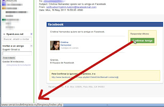En la siguiente captura se puede ver un correo falso que simula ser enviado por Facebook, al hacer clic se termina en una página que intenta robar el usuario y la contraseña de la víctima: