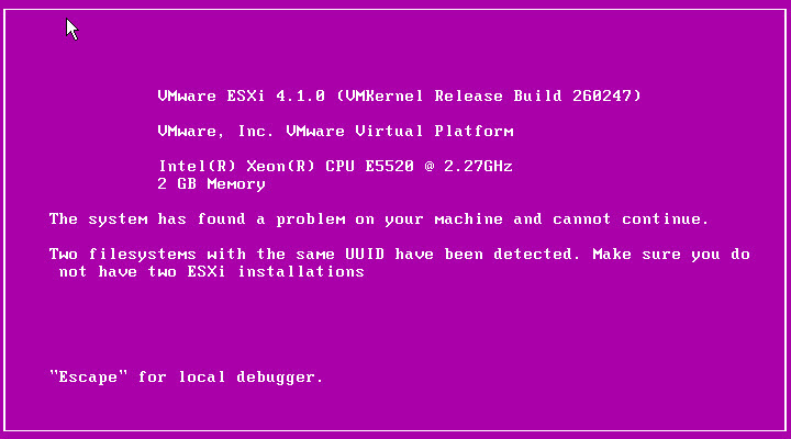 Lo bueno de hacer laboratorio, es que muchas veces se generan errores , los cuales podemos resolver sin tener la presión del cliente. En este caso después de hacer pruebas de clonación de discos al bootear la «nueva» instalación me encontré con una bonita PSOD «Purple Screen Of Death» , el error es debido a que ambos datastore tienen el mismo UUID.
