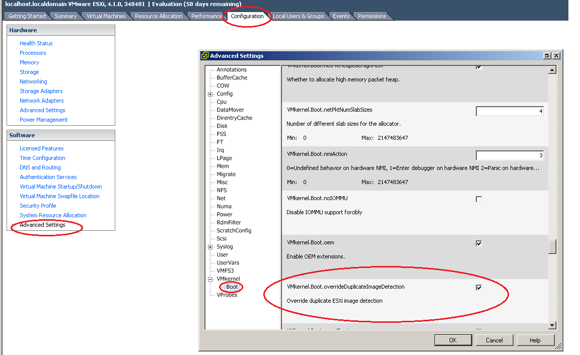3º Vmkernel –> Boot y buscamos y tildamos VMKernel.Boot.overrideDuplicateImage y lo tildamos.