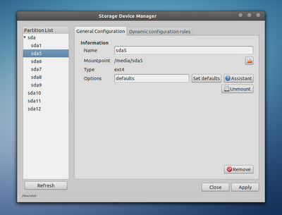 PySDM es una interfaz para publicar las configuraciones del archivo fstab (/etc/fstab). En este archivo es posible especificar las particiones que se automontan al inicio, crear reglas udev dinámicas, entre otras cosas.