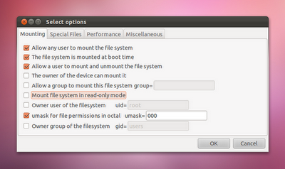 Para una partición NTFS, en cambio, las mejores opciones son las siguientes (en especial, asegurate de que «Mount file system in read-only mode» se encuentre deshabilitada):