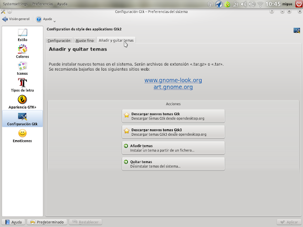 Y por último, en la tercera pestaña puedes añadir y librar temas Gtk. Dichos temas los puedes apostar localmente, desde tu disco duro, o puedes descargarlos directamente desde «Gnome-look».