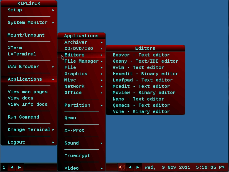 Y, por fin, el submenú Applications, quizá el más importante si tenemos en cuenta la finalidad de esta distribución: