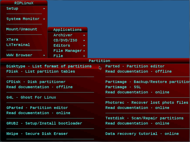 No, Linux no se ha muerto… Afortunadamente, en este contingencia «RIP» no significa «Requiescat In Pace» (Descanse En Paz), estrella que son las siglas de «Recovery Is Possible» (La Recuperación Es Posible); así es, la recuperación de datos y la gestión de particiones es el objetivo primero de RIP Linux, que ya va por la traducción 13.5. Esta distribución se nos presenta como un Live CD de 154 MB, cuya concepto ISO nos podemos bajar de su página oficial.
