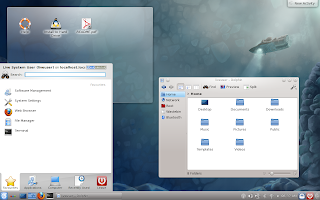 El escritorio KDE tiene un diseño personalizado con las aplicaciones por falta específicas, tales como Firefox para navegar y VLC para los medios de comunicación, etc