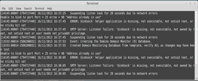 Si eso no funcionaba, y créanme que suceda, entonces algo está acaparando el puerto. Compruebe apache o Postfix, etc Si se trataba de un servidor existente o en un servidor que no tienen una instalación limpia entonces en algún momento puede que no sea capaz de superar este problema. Con mis estaciones de trabajo se instala una gran cantidad de software usando dselect y hago esto para los servidores también. Algo salió mal y en algún momento hay que cortar sus pérdidas y volver a instalar el sistema operativo. He reinstalado una versión limpia de Linux Mint 16 y que está funcionando perfectamente ahora. ¿Quién sabe?