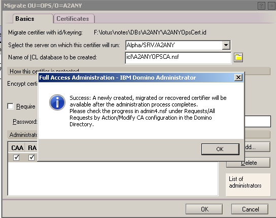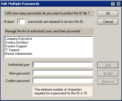 El valor predeterminado para un certificador es una sola contraseña. Lo que esto significa es la contraseña maestra es compartida a todo el personal de TI. Por experiencia esta contraseña es la misma para todos los archivos de identificación que me he encontrado en muchas organizaciones grandes. La mejor opción es crear múltiples contraseñas y sólo compartir las contraseñas correspondientes. También puede forzar más de una contraseña para que los administradores no pueden crear usuarios para certs especiales org. La mejor opción es, por supuesto, mediante el proceso de CA. />