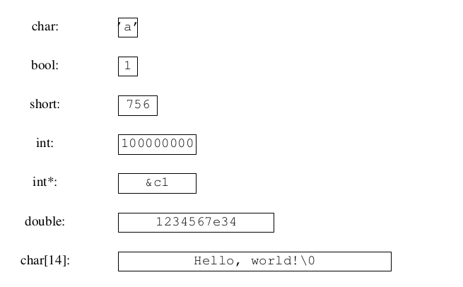 Ejemplo declaraciones de variables: Esta es una representación gráfica de un conjunto plausible de los tipos fundamentales y una cadena de ejemplo: