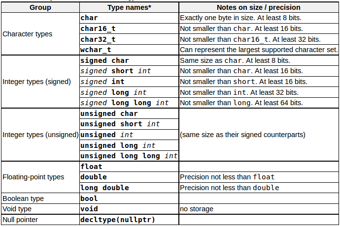C + + tiene un conjunto de tipos fundamentales correspondientes a las unidades básicas de almacenamiento más comunes de un ordenador y de las formas más comunes de utilizarlos para almacenar datos.