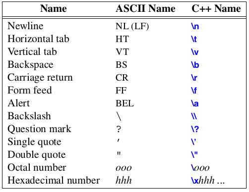Unos personajes también tienen nombres estándar que usan la barra invertida como carácter de escape, por ejemplo, n es una nueva línea y t es un tabulador horizontal Éstos se llaman los caracteres de escape