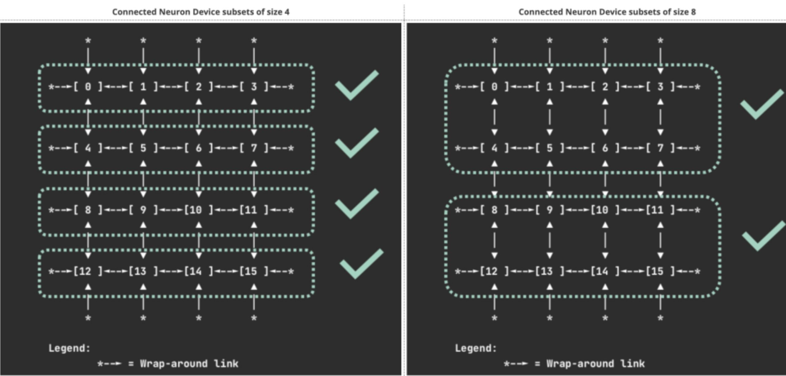 Un punto operativo importante es el soporte de subconjuntos conectados de dispositivos (1, 4, 8 o 16), que evita depender de extensiones externas para ciertos patrones de asignación contigua. También aparece la configuración por workload de Logical NeuronCore (LNC), útil para ajustar consumo sin preconfigurar toda la flota mediante launch templates.